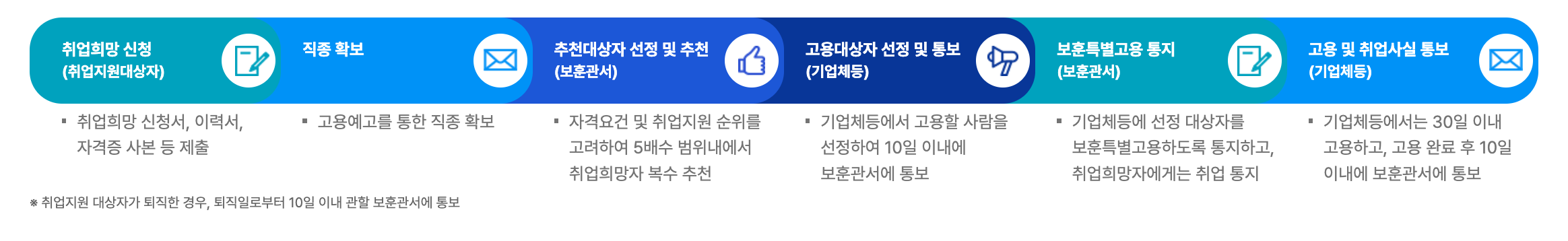 취업지원대상자는 독립유공자, 국가유공자, 보훈보상대상자, 5.18민주유공자, 특수임무유공자, 고엽제후유의증환자, 장기복무 제대군인 등이 있습니다. 각 대상자에 해상 하는 자세한 조건사항은 국가보훈부 취업정보시스템의 취업지원 대상자 항목에서 알아보실 수 있습니다.